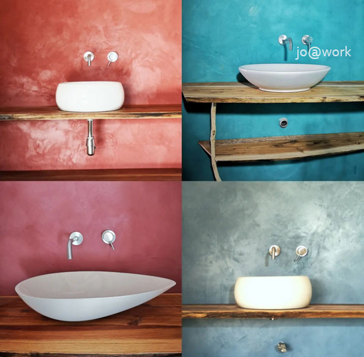 Uma alternativa mais económica são os nossos “stuccos de cal” à base de cal aérea tradicional. Os nossos stuccos de cal são também adequados para uso exterior e chuveiros, com as mesmas restrições descritas acima para Tadelakt. São visualmente indistinguíveis de Tadelakt, mas custam um pouco mais de metade do preço. Não são polidas com uma pedra, mas “apenas” alisadas com uma talocha veneziana com pressão.